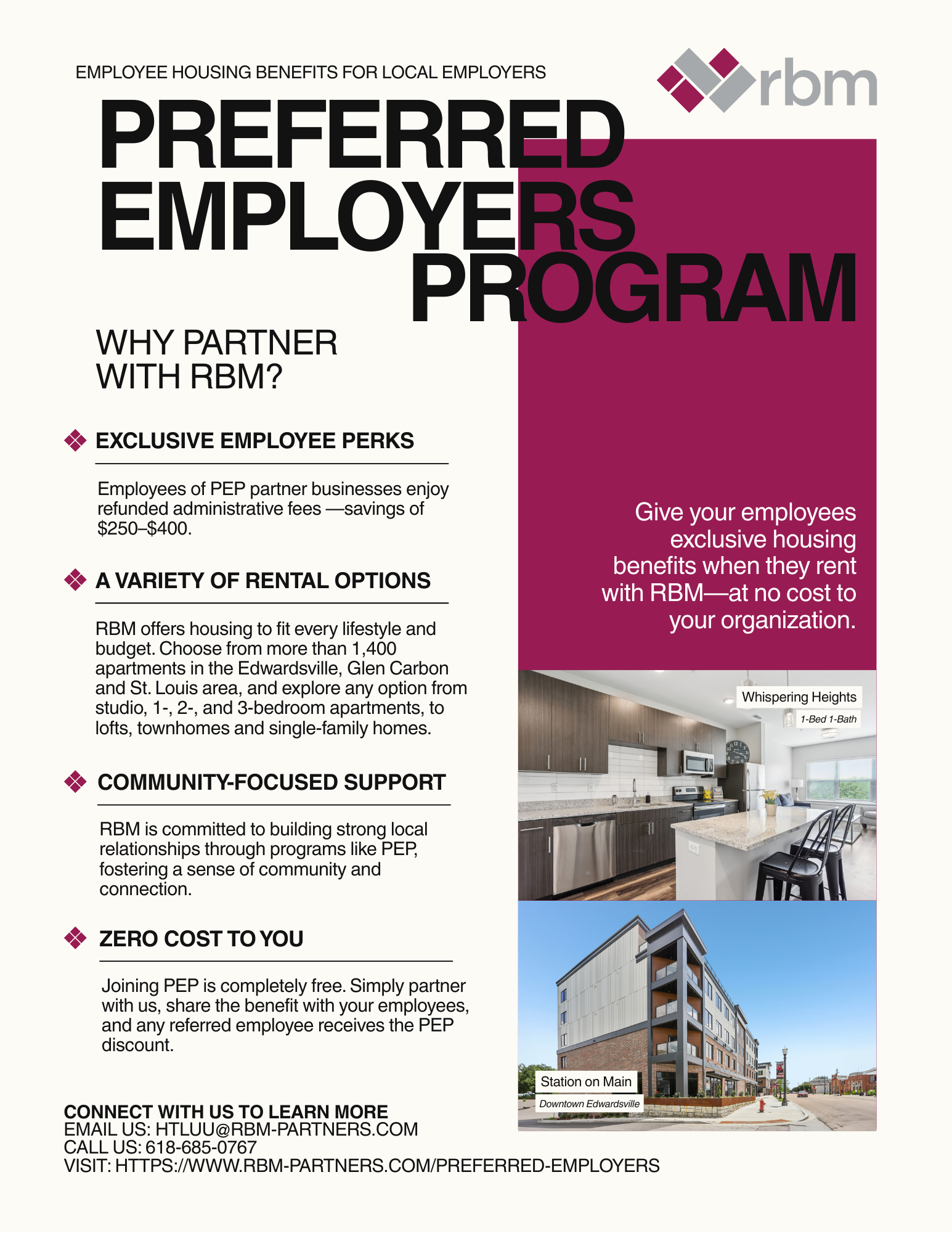 We are proud to partner with local businesses and institutions to offer their employees exclusive discounts when renting with RBM! Below are resources for you to learn more about the zero-cost benefits of being a PEP partner for your organization, as well as ways to get involved!